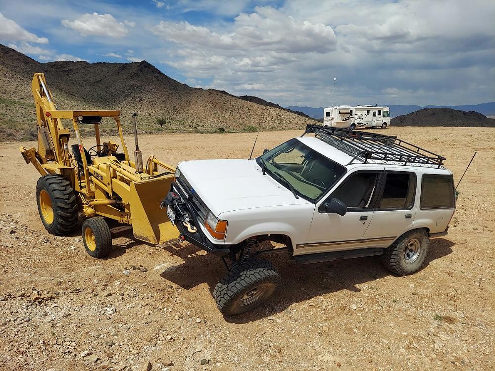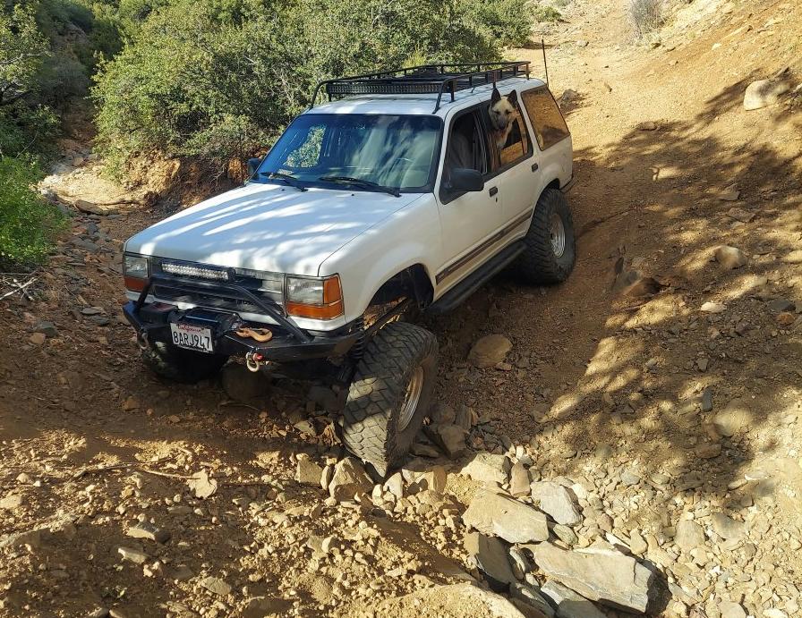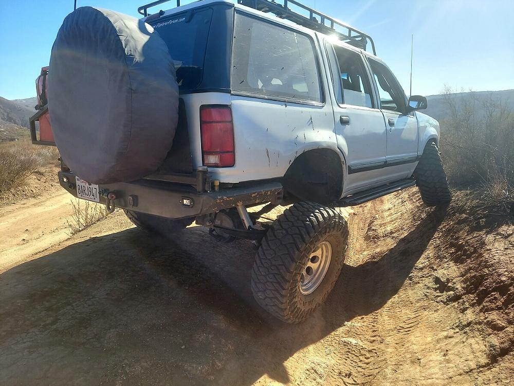 Vehicles built today offer very little suspension travel. If a tire is off the ground, it can’t move the vehicle forward. If you have enough suspension travel to keep the tires on the ground, and lockers to send power to all four tires, you’re far more likely to be about to continue forward movement without getting stuck. In the photo below you can see that this Explorer has a great deal of suspension travel, and all four tires are making contact with the ground. If you look at the relation of the rear axle and front axle it’s almost making an ‘X’.