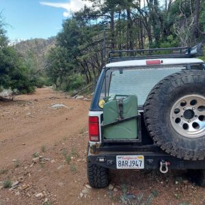 - Custom rear bumper with swing out tire / gas can rack, CB antenna mount and side protection