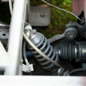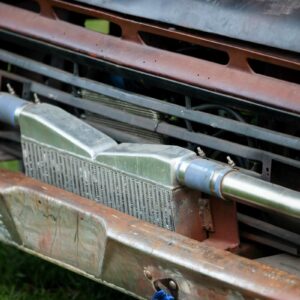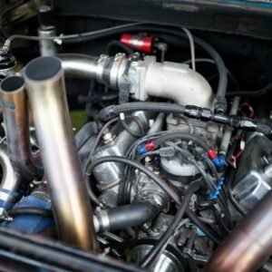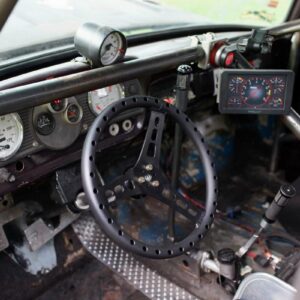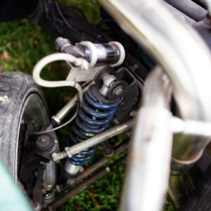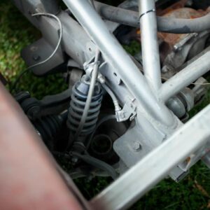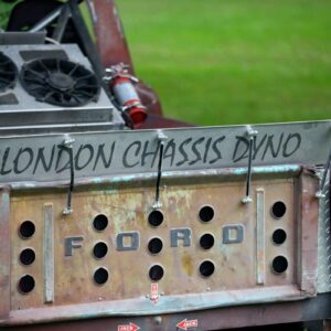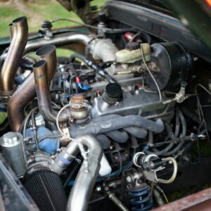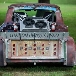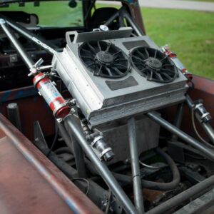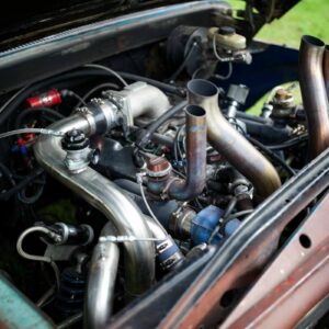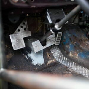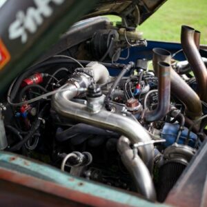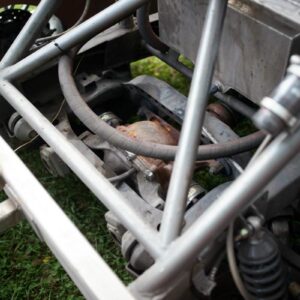 The rear axle and suspension is an IRS setup from a 2015 Ford Mustang. Power is sent to the rear by a G-Force transmission four-speed dog box.