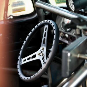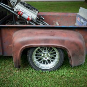 The front suspension is mostly custom and uses Wilwood 2.5-inch drop knuckles, a custom fabricated single upper A-arm, and single lower control arms that widened the track width by 6-inches.