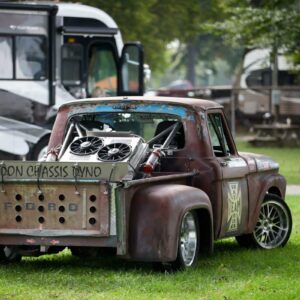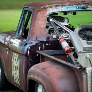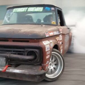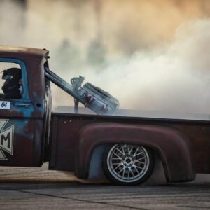 David found a 1964 Ford F-100 cab, frame, and some fenders that a guy had for sale down in Georgia. He built the truck in to a competitive drift truck that went through a few transitions before ending up with a Dart 363ci small block that makes just over 1,000 horsepower thanks to a pair of Garrett 3076 Gen II turbos and a Holley HP EFI setup. Check out how the intercooler is plumb through the headlight openings. The radiator is mounted in the open bed to help keep the truck cool while shredding tires around the drift course.