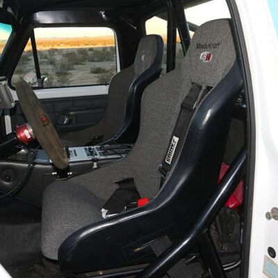 Inside the truck retains the stock dash with custom aluminum gauge inserts. Widener chose Auto Meter gauges and hung a nice big tach/shift light from the roll cage downtube. Twin Mastercraft 3G seats with Crow Instruments harnesses secure the occupants while the driver holds the MOMO steering wheel and Winters reverse-pattern shifter.
