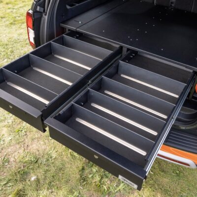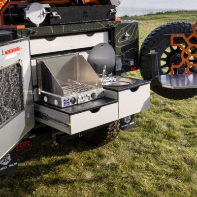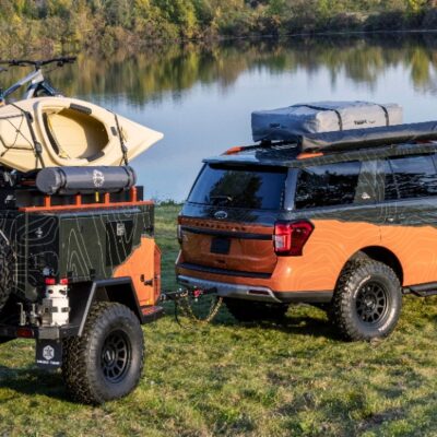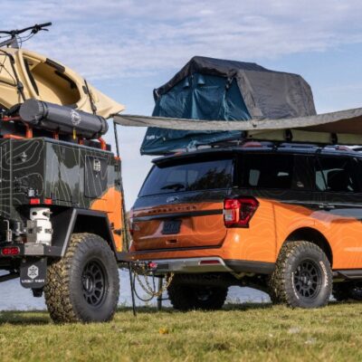 With a Turtleback Expedition Series Trailer, the largest trailer in the Turtleback lineup, the capability of the Expedition Timberline concept vehicle is further extended in the wilderness. The trailer matches the Expedition Timberline Off-Grid concept with Method brand wheels and Grabber all-terrain tires. It’s designed to hold additional gear for an extended cross-country trip, including a two-burner propane stove and deep-well sink, a pair of drop-down tables, 42-gallon water tank and six-gallon water heater with external shower hookup, plus pancake propane tank. Additional available options include a refrigerator and a 100-watt solar panel.