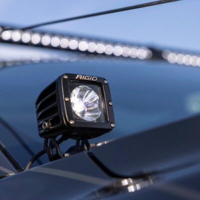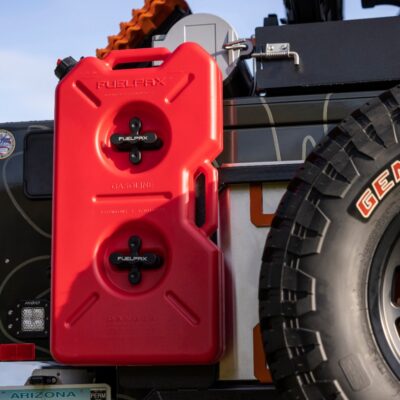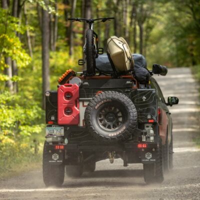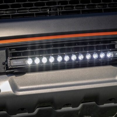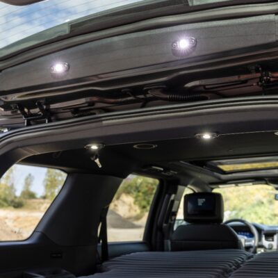 Illuminating the trail and the campsite at night, a 50-inch Rigid light bar is mounted above the windshield with an additional Rigid 20-inch light bar below the grille, while D-SS Rigid side shooter cube lights are installed atop the hood. Rigid spotlights mounted within the wheel wells and liftgate further illuminate those areas. The flip of a switch turns the lights red for stargazers.
