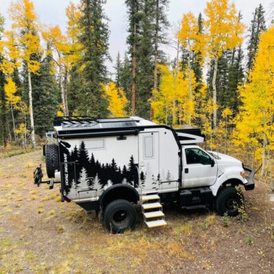 The camper’s chassis has everything you need to keep you and your family on the road as you try to outrun any potential zombie invasions. It is powered by a 7.2-liter engine, coupled with a 240-gallon fuel tank, a semi-automatic tire inflation system, front winch and auxiliary lights.