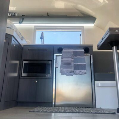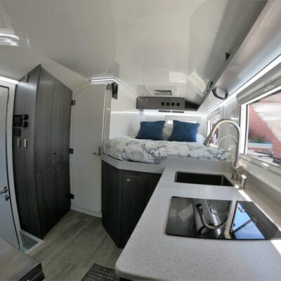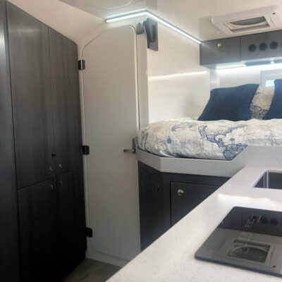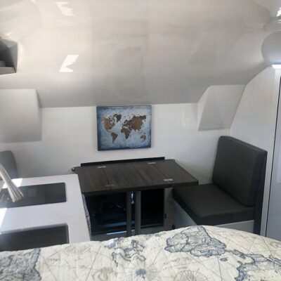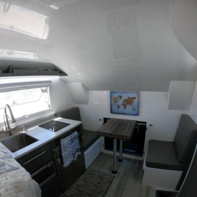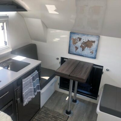 The camper body has a kitchen with a sink, induction stove, fridge and microwave, as well as a two-person dining area with a table and benches.
