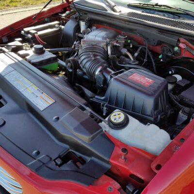 Perhaps the most significant component in the creation of power and torque is the Eaton Gen-IV supercharger sitting atop the intake system. This Roots-type supercharger has a cast aluminum case, machined aluminum internal rotors, and its own dedicated drive belt. The supercharger, and the water-to-air intercooler sitting directly below it in the vee, are the components most responsible for the phenomenal horsepower and torque figures of the SVT Lightning.