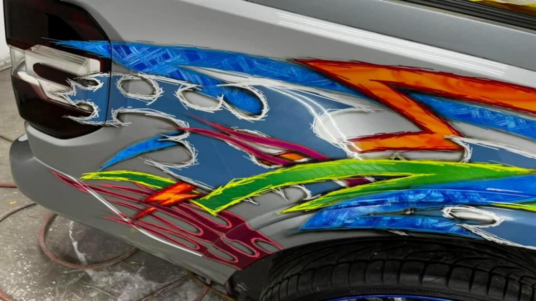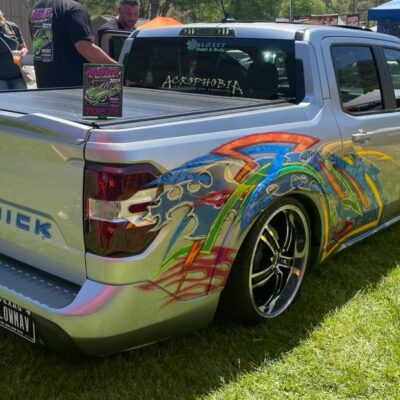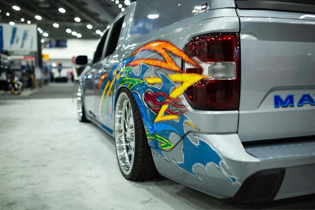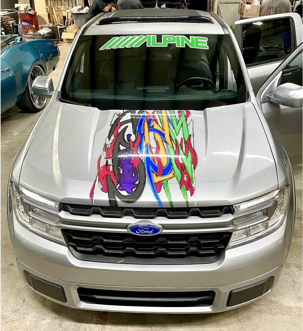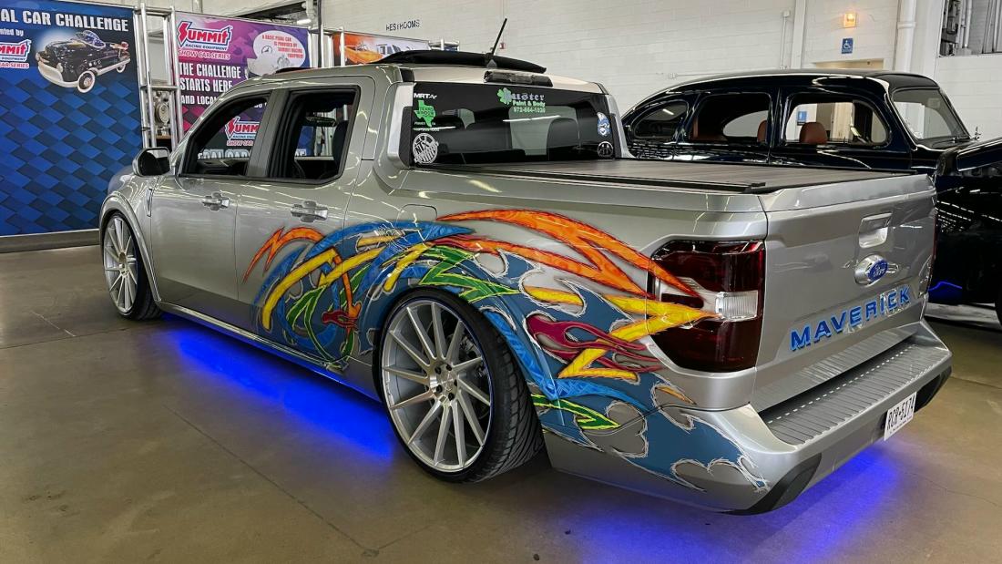 Kenneth started with a silver 2022 Ford Maverick XL, lowered it using a custom Chassis Tech air suspension with raised strut towers, and added bold tribal graphics painted directly onto the body. No vinyl or wraps were used — every detail is hand-finished for show-quality appeal.