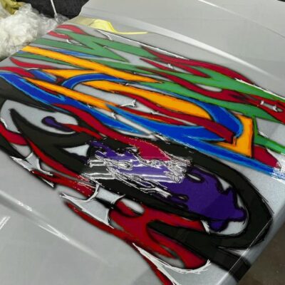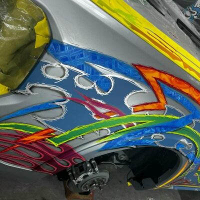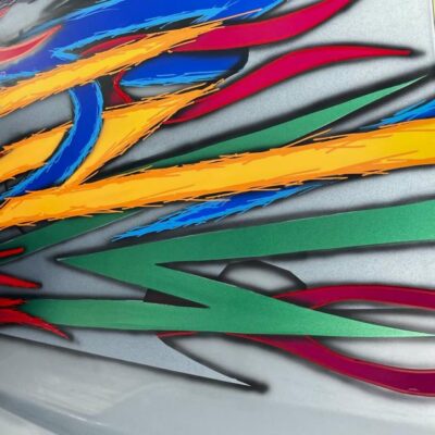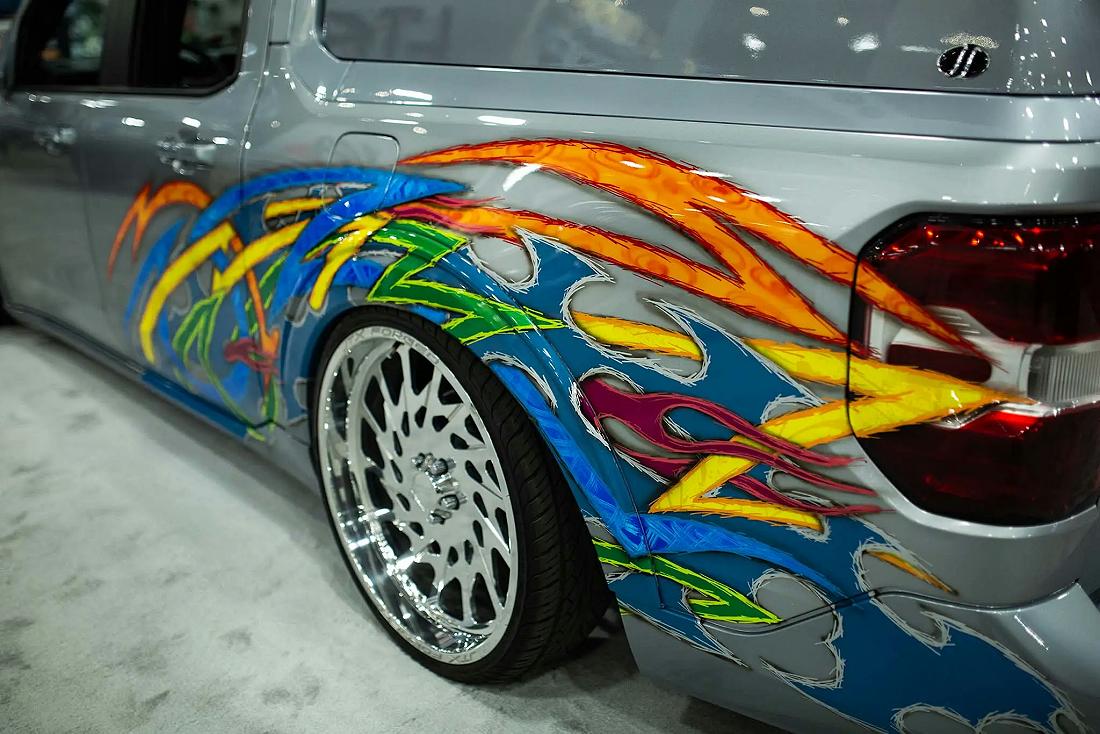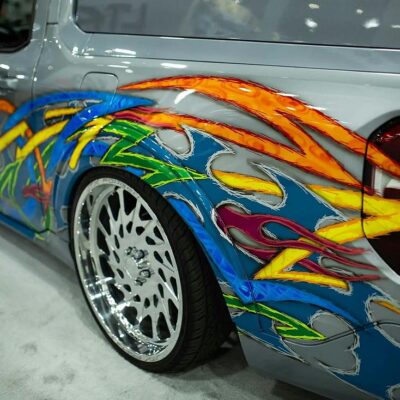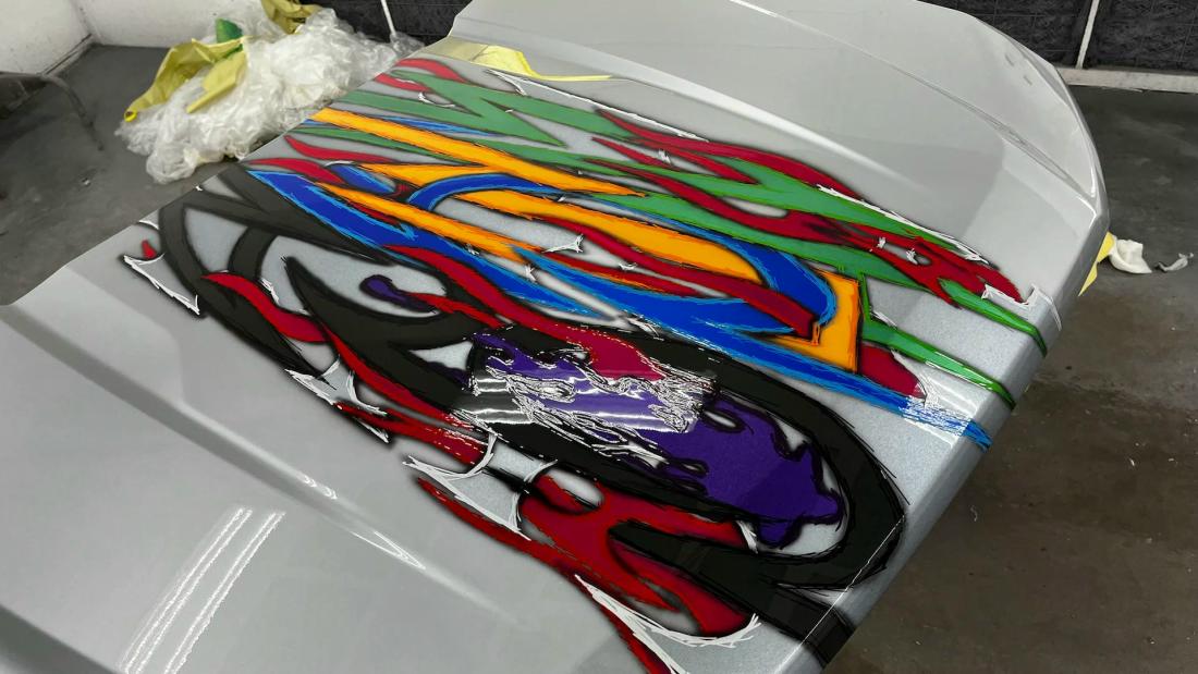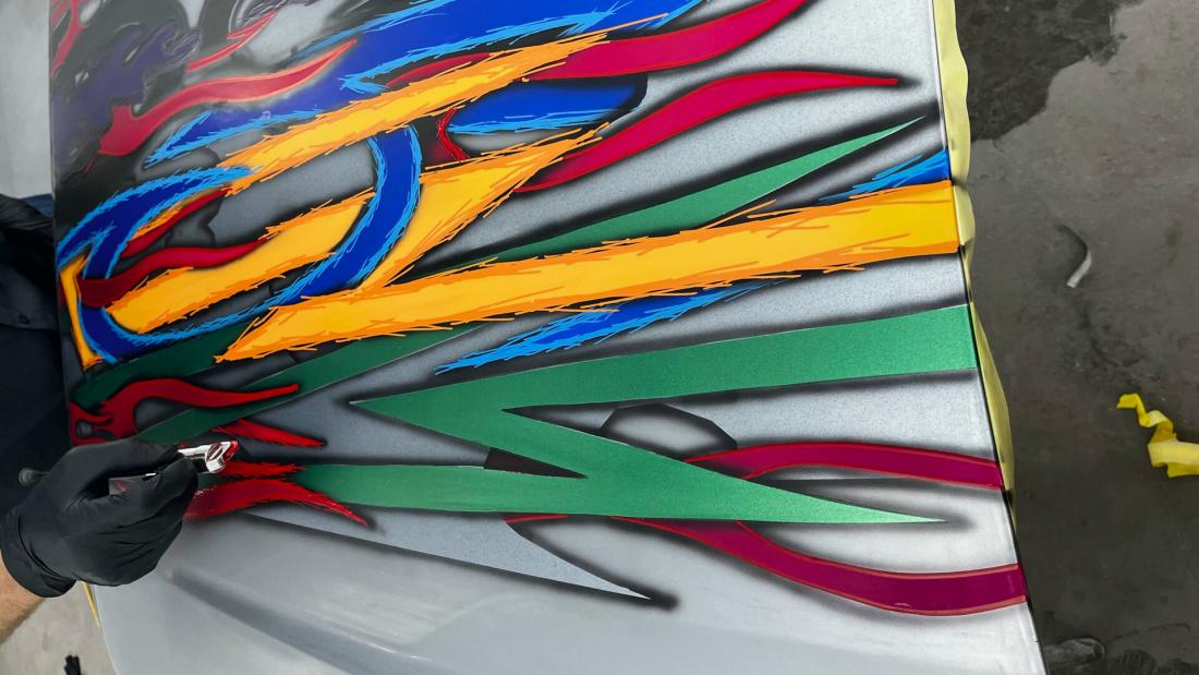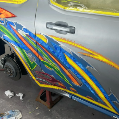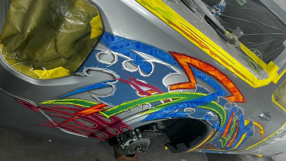 Kenneth started with a silver 2022 Ford Maverick XL, lowered it using a custom Chassis Tech air suspension with raised strut towers, and added bold tribal graphics painted directly onto the body. No vinyl or wraps were used — every detail is hand-finished for show-quality appeal.