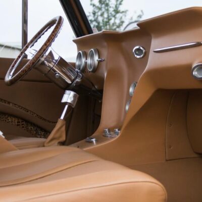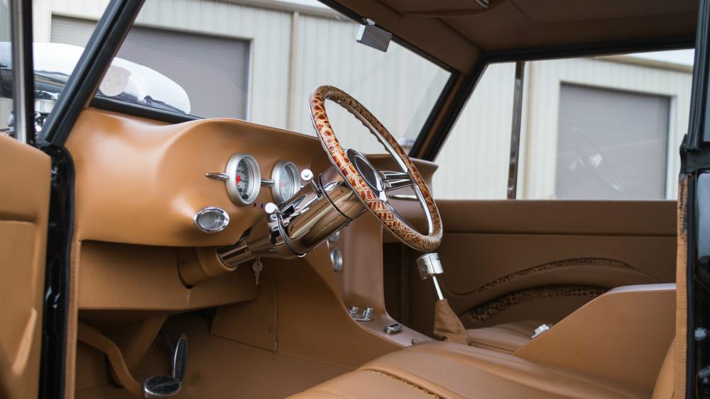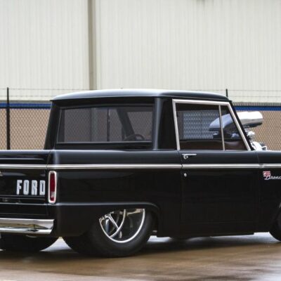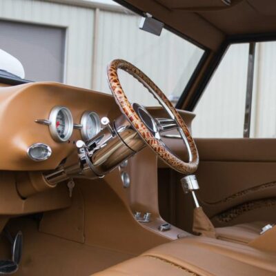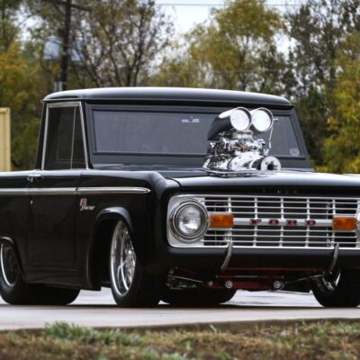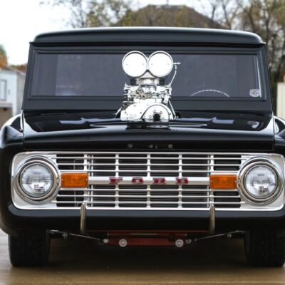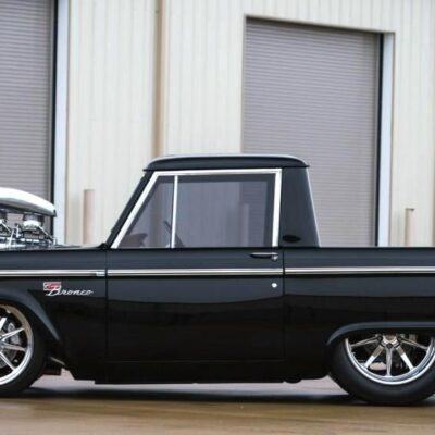 In 1966, Doug Nash built a Bronco funny car for quarter-mile competition turning in times as low as 8 seconds. This 1967 Bronco has been fully addressed with both racing and luxury in mind. It’s powered by a 502 CI V-8 engine that’s been ported, polished and blown. Fed by dual Demon carburetors and a stainless-steel 14-gallon fuel cell, it uses a Childs and Albert Supercharger, Brodix heads, Comp Cam, 10:1 ratio pistons and breathes through 2-1/2 inch headers and 5-inch jet coated exhaust. A Turbo 400 automatic transmission sends power to a narrowed Ford 9-inch rear end, and all the torque is held in check by a 4-link rear suspension, Mustang II spindles and a custom Art Morrison chassis. A rack-and-pinion steering system and Baer 4-wheel disc brakes add civility along with the full-custom interior by M&M Interior in Holy Pond, Alabama. Covered in tan with alligator inserts, the interior boasts a custom piston shifter, Auto Meter Pro Comp gauges and a billet steering wheel. Vintage Air and a Sony Xplod CD stereo system keep passengers comfortable and entertained over the massive drivetrain.