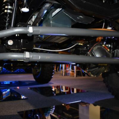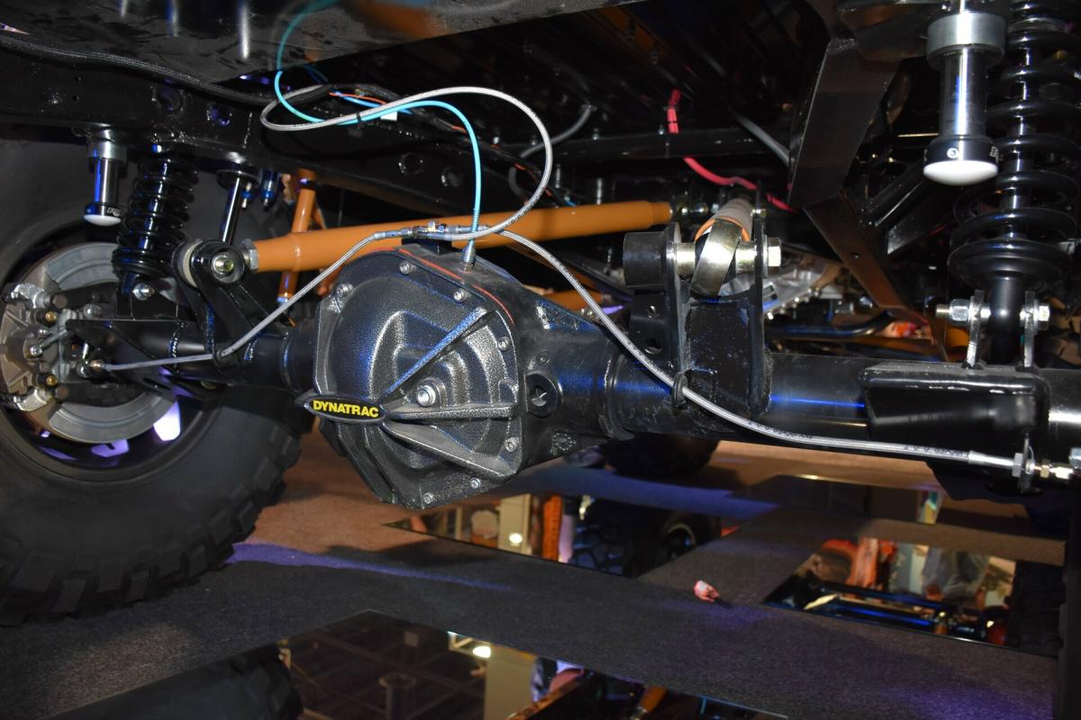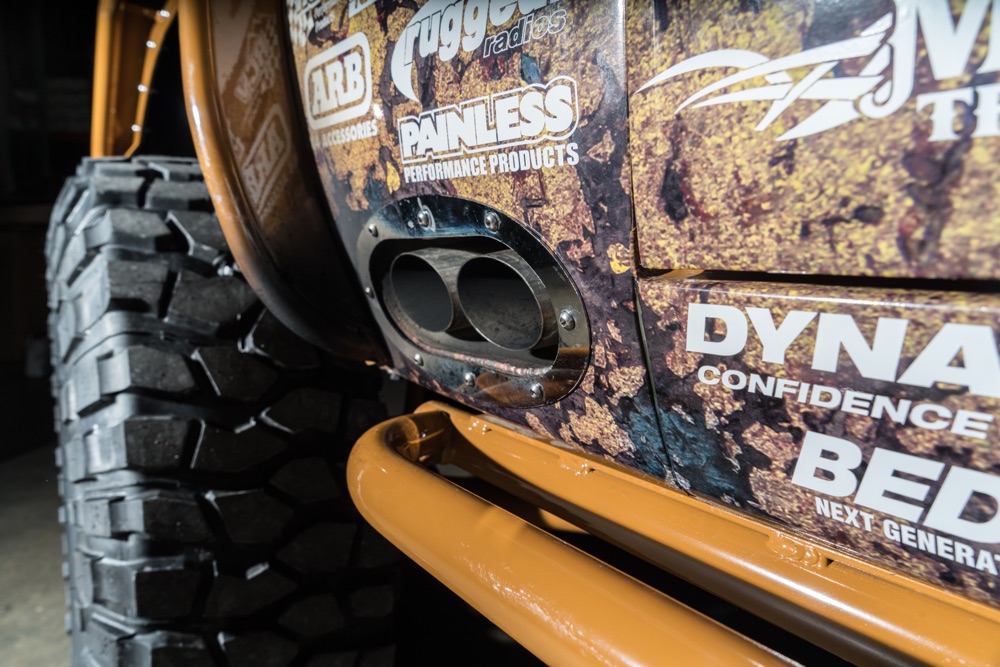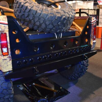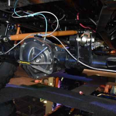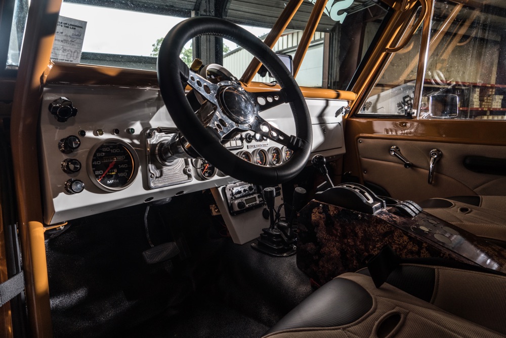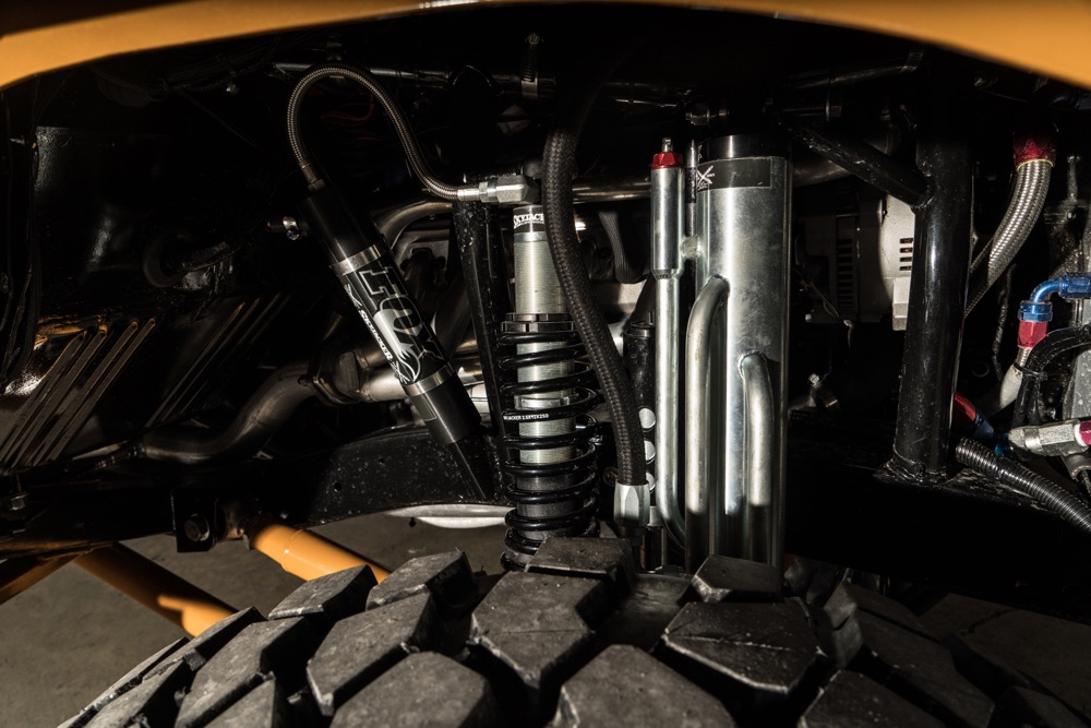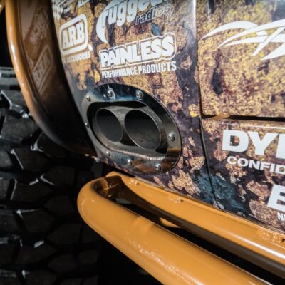 Given the goal to create a real off-road beast, the frame was stretched 8-inches while short-course legend Curt LeDuc was called in to create a custom suspension that pushes the front Dynatrac Dana 60 axle forward 3-inches and the matching rear axle back 3-inches as well. A roll cage was fabricated, which holds the larger CBR Performance radiator and spare tire.