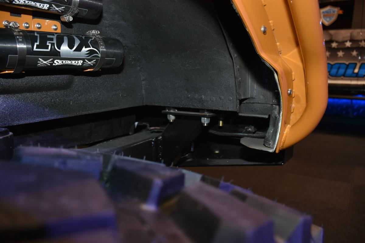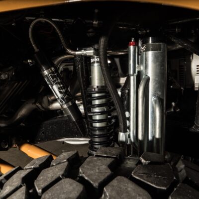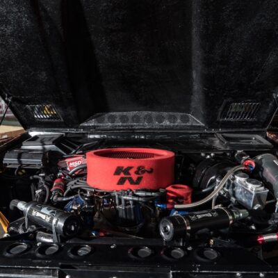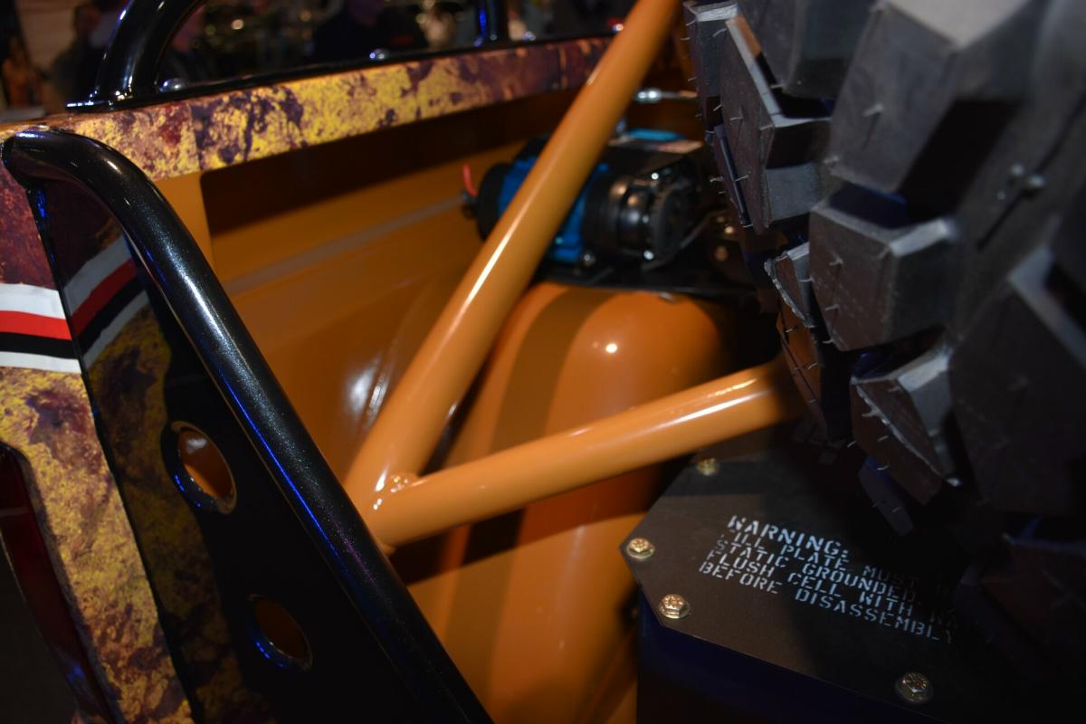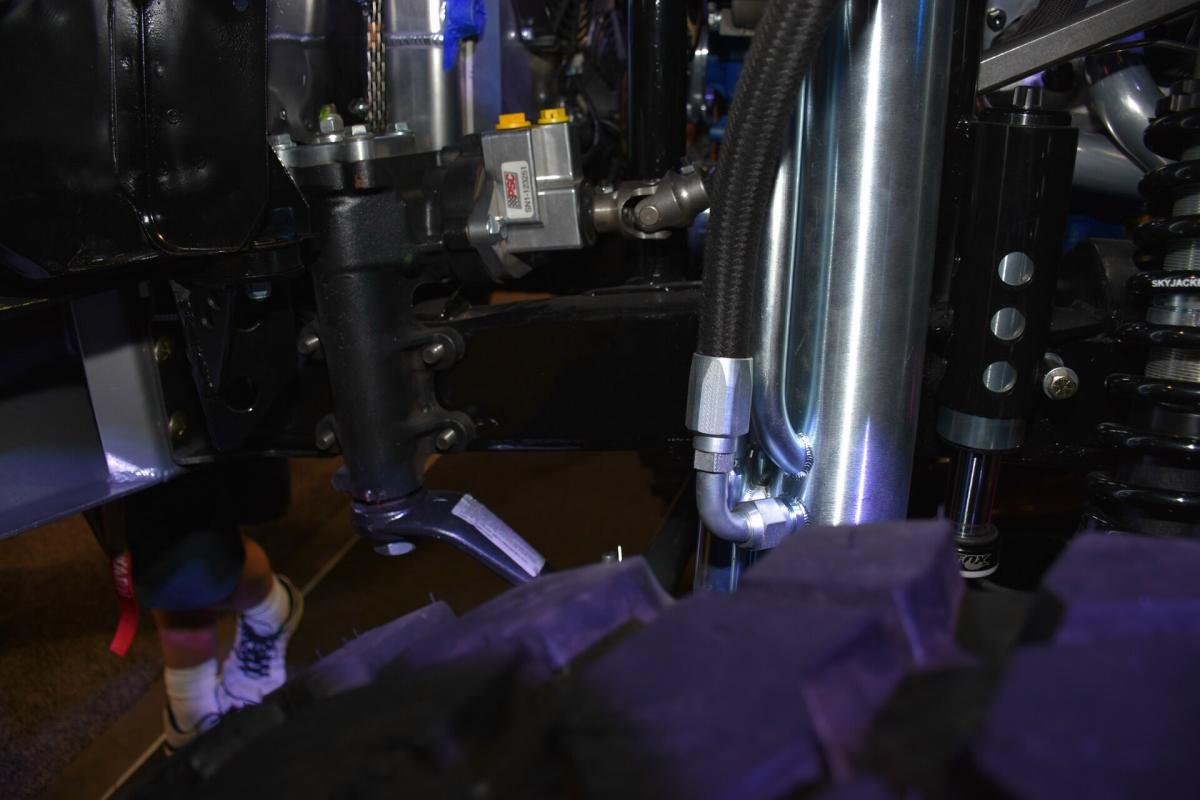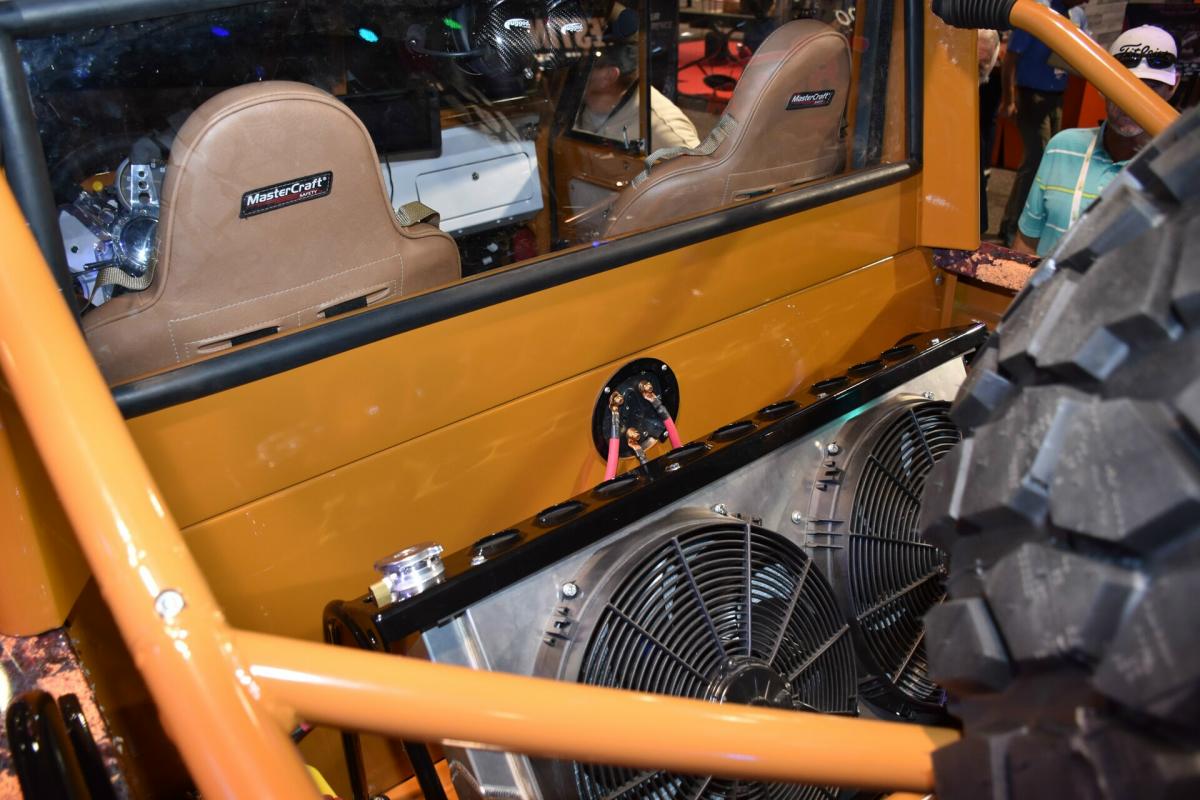 Given the goal to create a real off-road beast, the frame was stretched 8-inches while short-course legend Curt LeDuc was called in to create a custom suspension that pushes the front Dynatrac Dana 60 axle forward 3-inches and the matching rear axle back 3-inches as well. A roll cage was fabricated, which holds the larger CBR Performance radiator and spare tire.