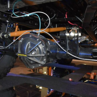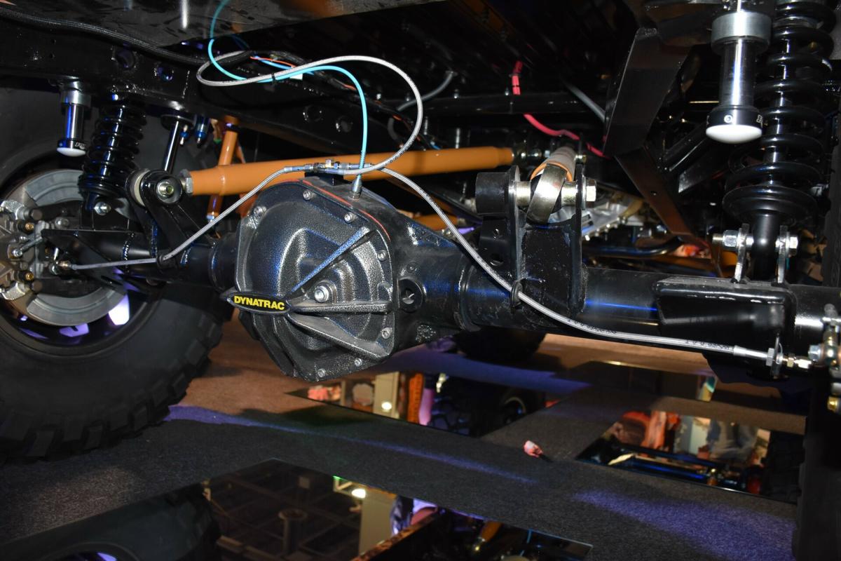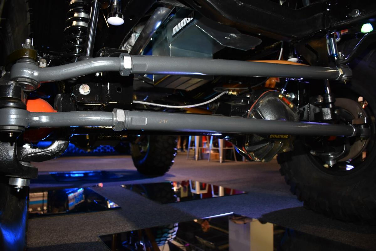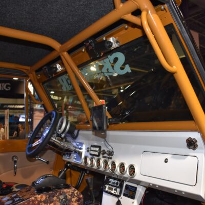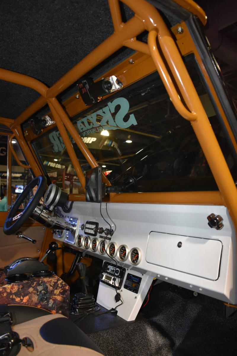 For now, know it’s a 1966 Bronco that was stretched. The frame was lengthened 8-inches in the center, the front axle was pushed 3-inches forward, and the rear pushed an additional 3-inches back for a total wheelbase of 106 inches. The engine is a 351 Windsor stroked to 427 cubes and the dyno numbers are impressive with a potent 656 horsepower and 650 lb/ft torque at 4,500rpm. Axles are from Dynatrac, and shocks are Skyjacker LeDuc Series coilovers. The suspension is a four-link with a track bar up front, and a triangulated four-link rear built to go fast and work on the trail.