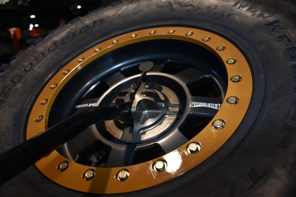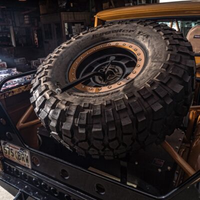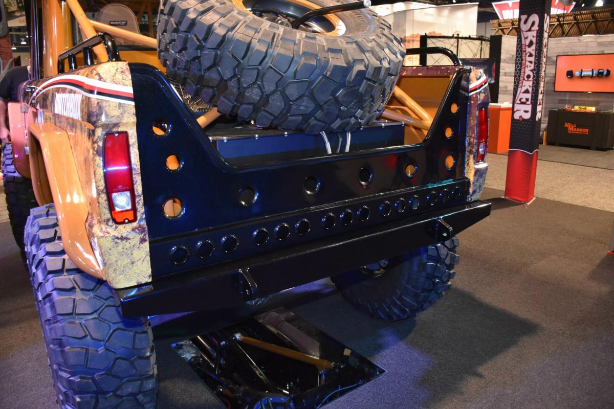 There were a few donor vehicles left behind from the build of the ’74, and they were used to help supply parts for this ’66 Bronco. With the body together, the wheel openings were moved outward to fit the new locations of the custom 17-inch Raceline beadlock wheels with 39-inch BF Goodrich Krawler tires. Finishing it off is a wrap that can be easily fixed if scratched.