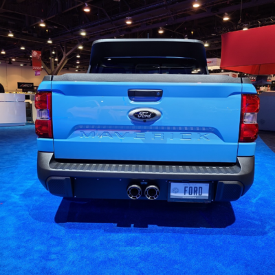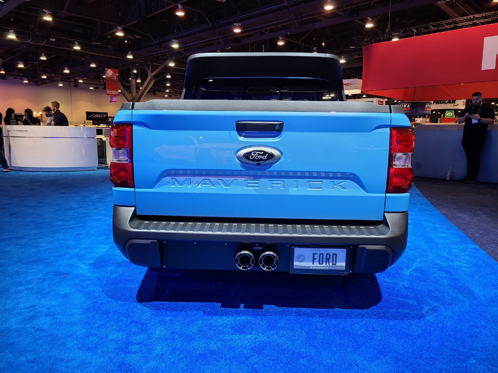 Most of the cosmetic work on the Tucci Hot Rods Maverick (the front spoiler, the dramatic rear spoiler at the end of the cab, the fender flares, the custom turbofan wheels) was done in-house, using a 3D printer. Other parts were outsourced, mostly the functional upgrades, like the Borla dual carbon fiber exhaust, the lowered suspension, or the tailgate assist.